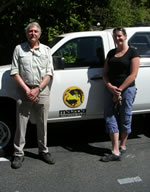 IMAGE: Ludwig’s Bustard Mazda Wildlife Fund vehicle: left, Humphrey LeGrice, Manager of the Fund, and right, PhD student Jess Shaw (Photo by Chris Tobler).