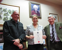 IMAGE: Award winner Sarah Lewis with Peter Johnson (right) and Prof. Phil Hockey (left). Photo by Rob Little.
