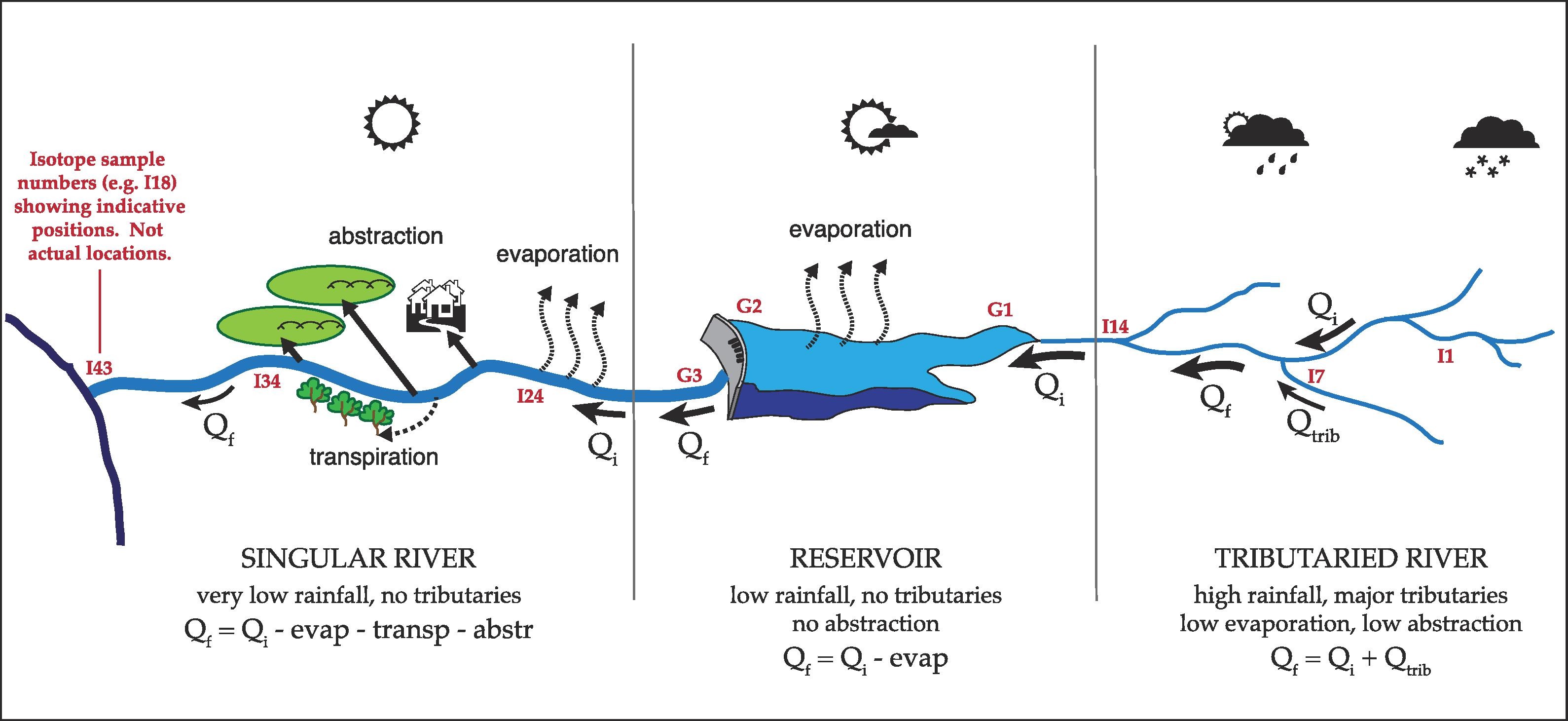 Figure: A schematic of the Gariep River, showing geographically distinct sections of river, on which different stable isotope calculations can be applied. For a tributaried river, contributions from tributaries can be calculated with one flow gauge measurement if stable isotope data exists for upstream and downstream of the confluence on the trunk stream, and for the tributary. For a reservoir, the proportion of evaporation can be calculated with only stable isotope data and if influent flow data is available, then the actual quantity of water evaporated can be calculated. For a “singular” river, where flow gauging data is available over a reach of river, the proportion of water abstracted can be calculated as that remainder of the losses after evaporation and transpiration have been accounted for.